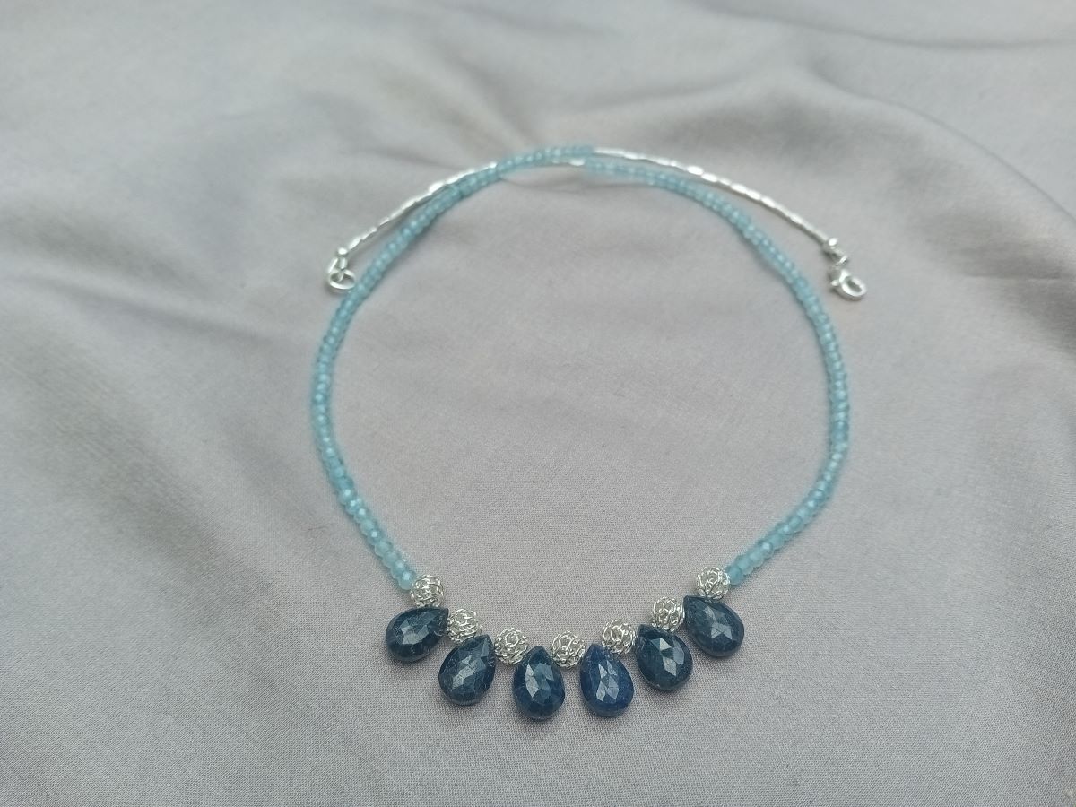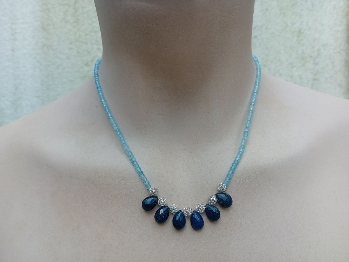 Náhrdelník akvamarín, safír brioletky, stříbro