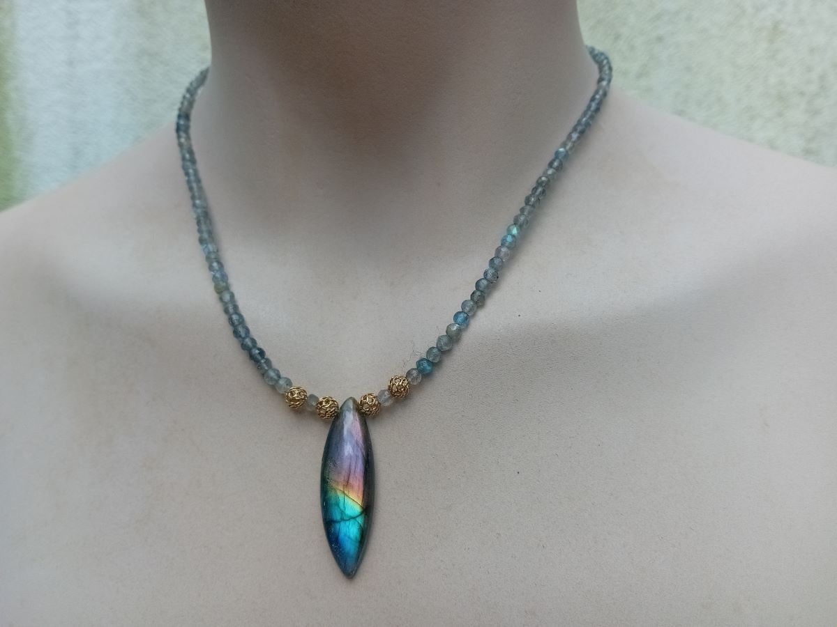 Složení: broušené rondelky labradoritu 3 mm, , přívěsek labradorit kabošon markýza 36*11 mm, stříbrné pozlacené 22 k ručně vyrobené filigránové korálky 6 mm a 1,3 mm, pozlacené stříbrné zapínání.