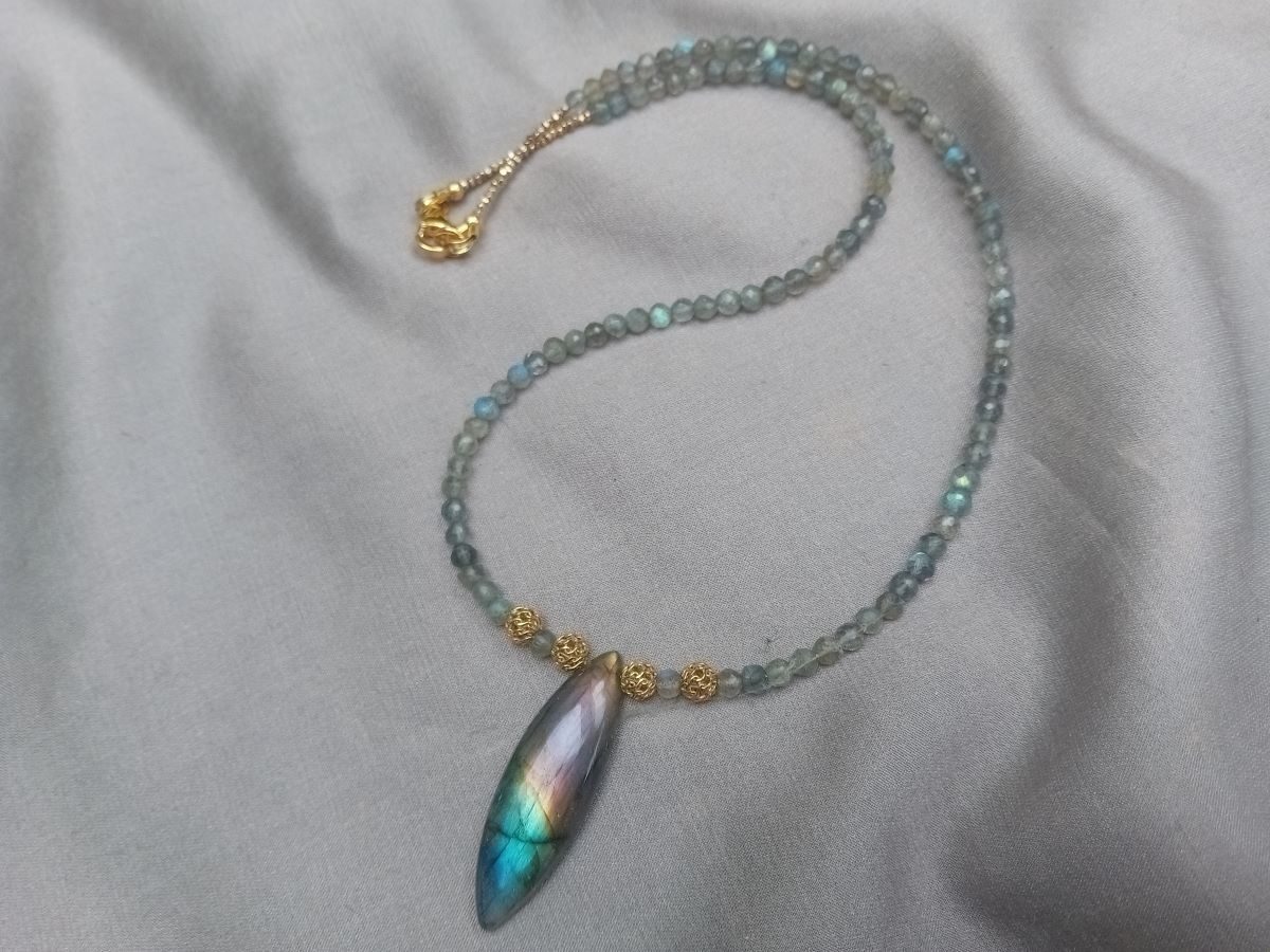 Náhrdelník z labradoritu, přívěs markýza, pozlacené stříbro