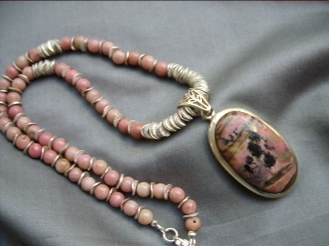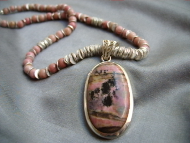 Jemný pudrově růžový rodonit působí něžně se stříbrnými broušenými disky a velký rodonitový přívěs zvýrazňuje černá kresba. Tento šperk podněcuje lásku a bratrství. Dodává sílu zbavit se závislostí, následků citového nebo sexuálního zneužívání, učí odpouštět a nemstít se za příkoří. Učí akceptovat jiné názory a konstruktivně řešit problémy. Pomůže dosáhnout vašeho nejvyššího potenciálu.