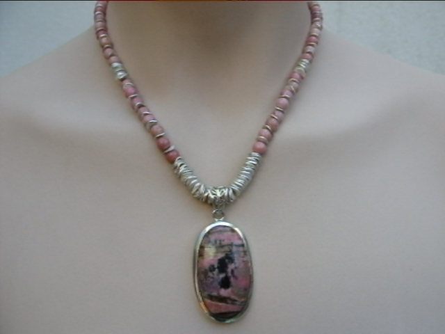 Náhrdelník rodonit s přívěskem z rodonitu a stříbra