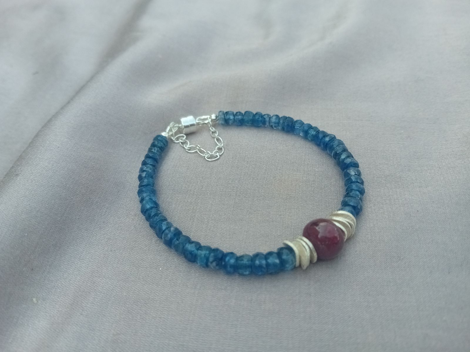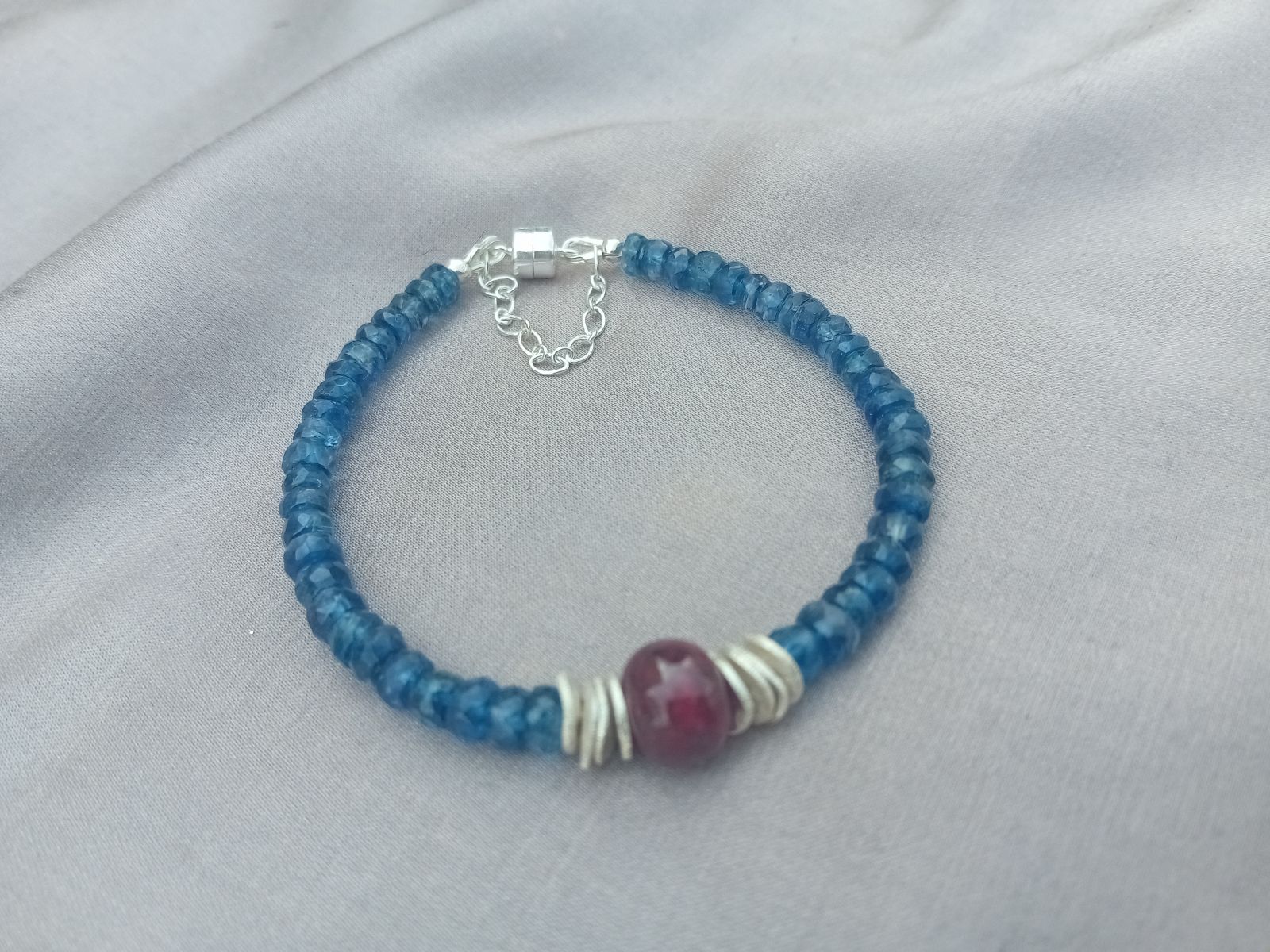 Nádherné tmavě modré broušené kyanity se oslnivě lesknou a kontrastují s vínovým rubínem. Tento jemný, elegantní šperk s vysokými vibracemi, vám pomůže naladit se na vnitřní vedení, být sama sebou a získat klid a vyrovnanost. Zažene strach, ochrání , podpoří životní energii i potenci, a zlepší komunikaci a naplní vaše srdce láskou.