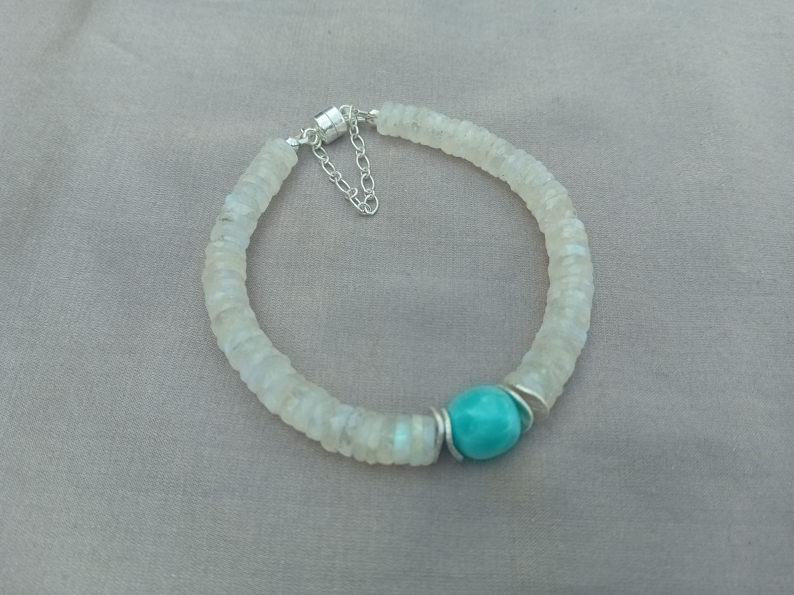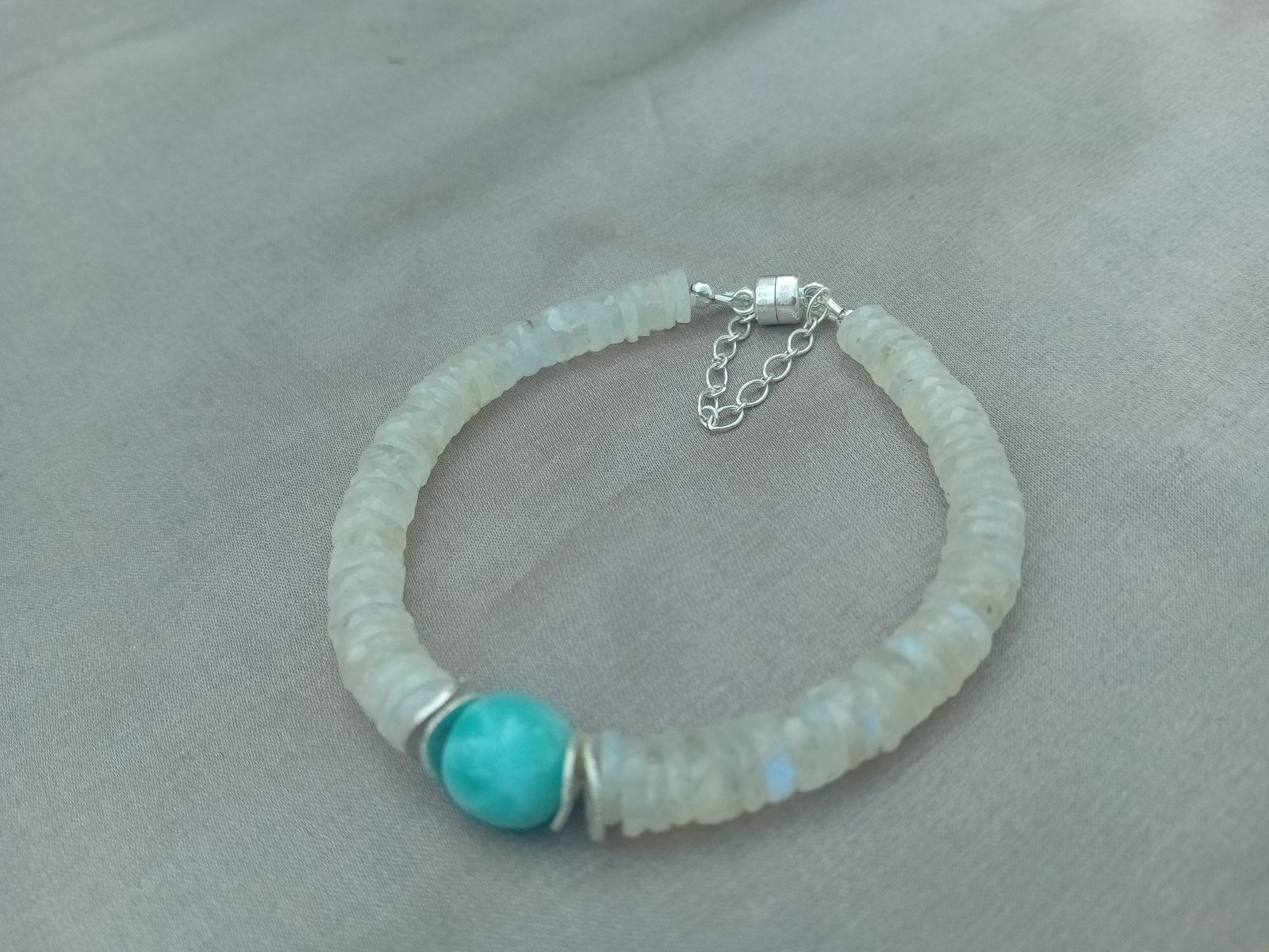 Náramek larimar korál, měsíční kámen, stříbrné disky 5